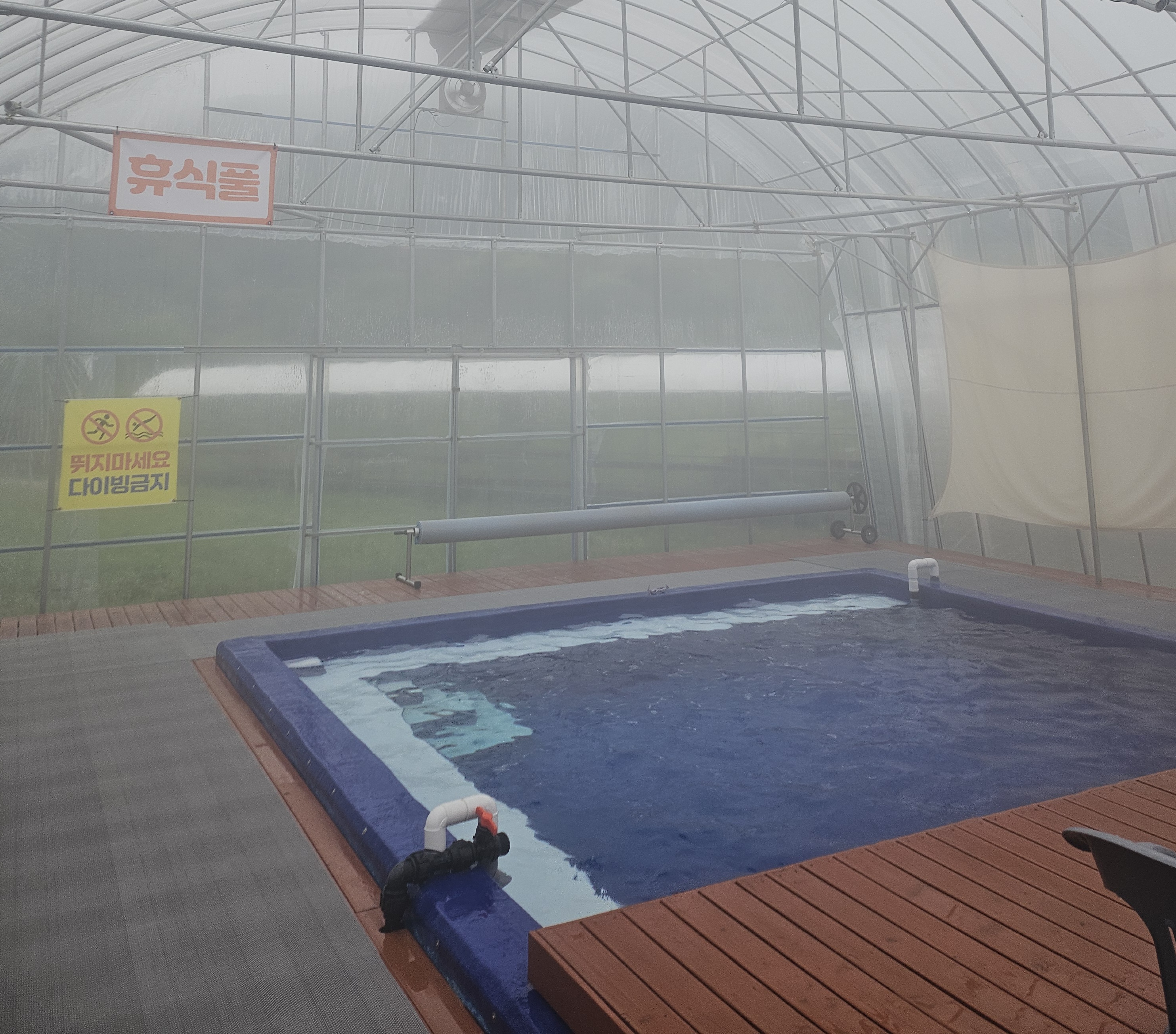 물놀이장은 평상쪽에 유아들을 위한 큰 풀장과 안쪽에 큰아이들을 위한 물놀이장이 있어요. 안쪽은 온수풀장으로 정말 따뜻하고 더워요!! 비오는 5월에 방문했는데 밖은 추워서 경량패딩에 담요두르고 있었는데 온수풀장은 긴팔티만 입고있어도 충분했어요👍
